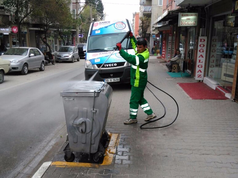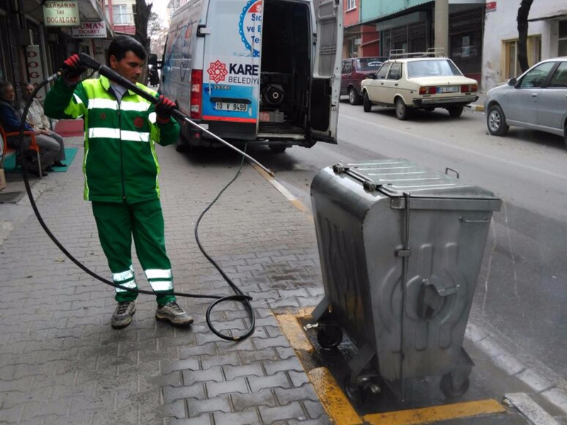 İlçenin temizliğine büyük önem veren Karesi Belediyesi, ilçe meydanlarını, konteynerleri, sıcak su ve buharla temizliyor. Aynı şekilde ekipler ibadethanelerde de temizlik çalışmalarını aralıksız sürdürüyor. Sıcak su ve buharlı yıkama aracının ürettiği 90 derece sıcaklıkta suyu, 200 bar basınçla püskürterek temizlik yaptığını belirten yetkililer, 1 ton su kapasiteli aracın haznesine deterjan koyularak elde edilen köpükle kir ve lekelerin kısa sürede yok edildiğini ifade etti. Tozu ve kiri sıcak su ve buharla ortadan kaldıran araç, cadde ve sokakların yıkanmasının yanı sıra YERKON ve çöp konteynırlarını da yıkanıyor.