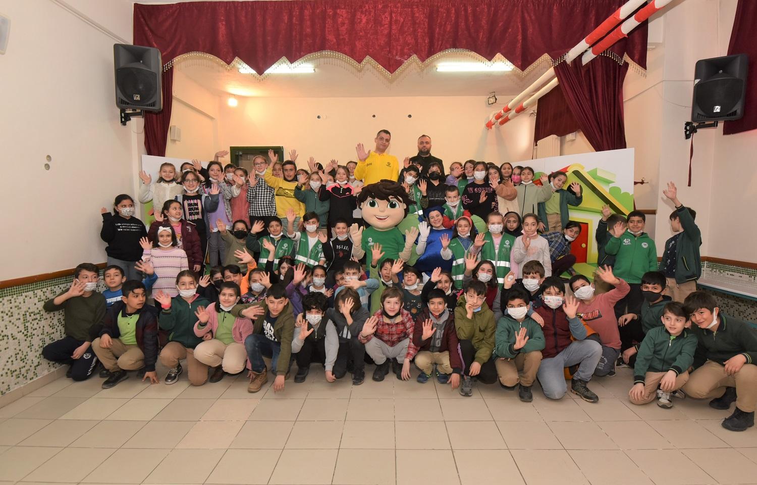 Sınıflarında Sıfır Atık Tiyatrosu’nu izleyen öğrenciler su tasarrufu, Sıfır Atık ve geri dönüşüm konularında kendilerini bilgilendiren oyunu büyük keyifle izlerken; bu anlamlı proje dolayısıyla da Karatay Belediyesi’ne teşekkür ettiler.