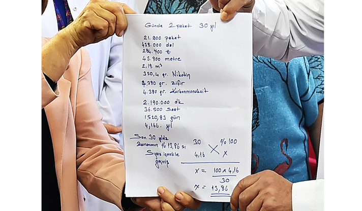 “Günde 2 paketten, 30 yıl boyunca 21 bin 900 paket yani 438 bin adet sigara içmişim. Bu sigaranın bana ortalama maliyeti 285 bin lira oldu. Hem cebimi hem de ciğerimi yaktım. Vücuduma 350.4 gram nikotin, 4 kilo 380 gram zifir aldım. Ayrıca 30 yılda zamanımın yaklaşık yüzde 14’ü sigara içmekle geçti. Yani boşa geçti.. Artık daha sağlıklı günlere adım atacağım.”