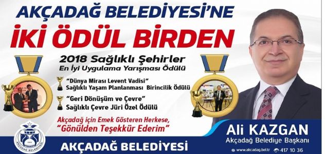 Akçadağ Belediyesi, Sağlıklı Kentler Birliğinin düzenlediği Sağlıklı Şehirler En İyi Uygulama yarışmasında “Dünya Mirası Levent Vadisi” projesi ile Sağlıklı Yaşam Planlaması ödülünün sahibi oldu. Yine Akçadağ Belediyesi Sağlıklı Kentler Birliğinin düzenlediği Jüri Özel Ödülünü hazırladığı