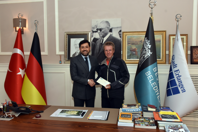 Beşiktaş Belediye Başkanı Av. Murat Hazinedar’ı makamında ziyaret eden Peter Smolka, Erlangen Belediye Başkanı Florian Janik’ten, Beşiktaş Belediye Başkanı Murat Hazinedar’a getirdiği mektubu verdi. Başkan Hazinedar da Erlangen Belediye Başkanı Florian Janik’e, yazdığı mektubu kendisine iletmek üzere Peter Smolka’ya verdi.