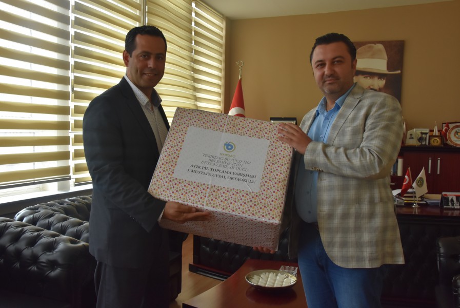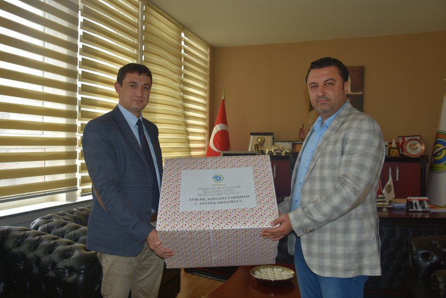 Belediye Başkanı Ulaş Yurdakul, Ödüllü Atık Pil Toplama Yarışmasında ikinci olan Malkara Atatürk Ortaokulu Müdürü Murat İşcan’a Spor Seti, üçüncü olan Malkara Mustafa Uysal Ortaokulu Müdürü Özgür Çetin’e Satranç Seti takdim etti.