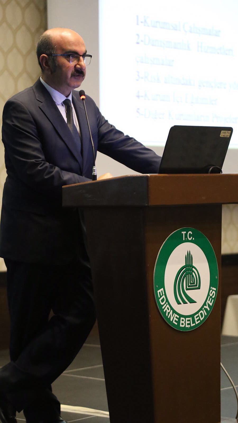 Edirne Belediye Başkanı Recep Gürkan burada yaptığı konuşmada belediyelerin görevinin artık sadece alt yapı yapmak olmadığını söyledi. Belediyelerin tıpkı canlı bir organizma gibi doğumundan bitimine kadar her şey ile ilgilenen kurumlar olduğunu anlatan Gürkan, “İlk etapta bağımlılıkla belediyenin ne işi var gibi bir klasik algı oluşuyor. Klasik belediyecilik anlayışı artık temel hizmetler arasına girdiği için onların söylenmesi bile gerekli görülmüyor. Bugün belediyecilik kent insanının daha konforlu, daha güler yüzlü daha başarılı hizmetler almasını zorunlu kılıyor. Bir evrim geçiriyor belediyecilik anlayışı” diye konuştu.