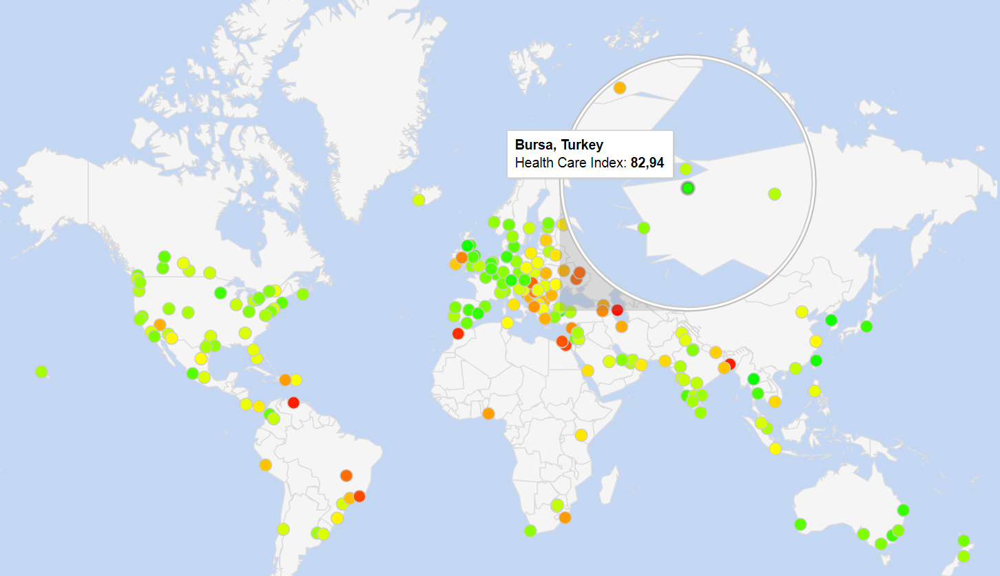 Numbeo’nun sürekli güncellenen verilerine dayanarak 199 şehirden oluşan dünyanın en sağlıklı şehirleri listesini de açıkladı. Dünyanın en sağlıklı kenti Tayland’dan Chiang Mai seçilirken, İngiltere Glasgow ikinci, Güney Kore Seul ise üçüncü sırada yer aldı. En sağlıklı kentler listesine Türkiye’den dört şehir girerken, Bursa 82.94 puanla 5’inci sırada yer aldı. İzmir 72.31 puanla 56’ncı, Ankara 68.56 puanla 89’uncu ve İstanbul da 67.63 puanla 94’üncü sıradan listeye girdi.