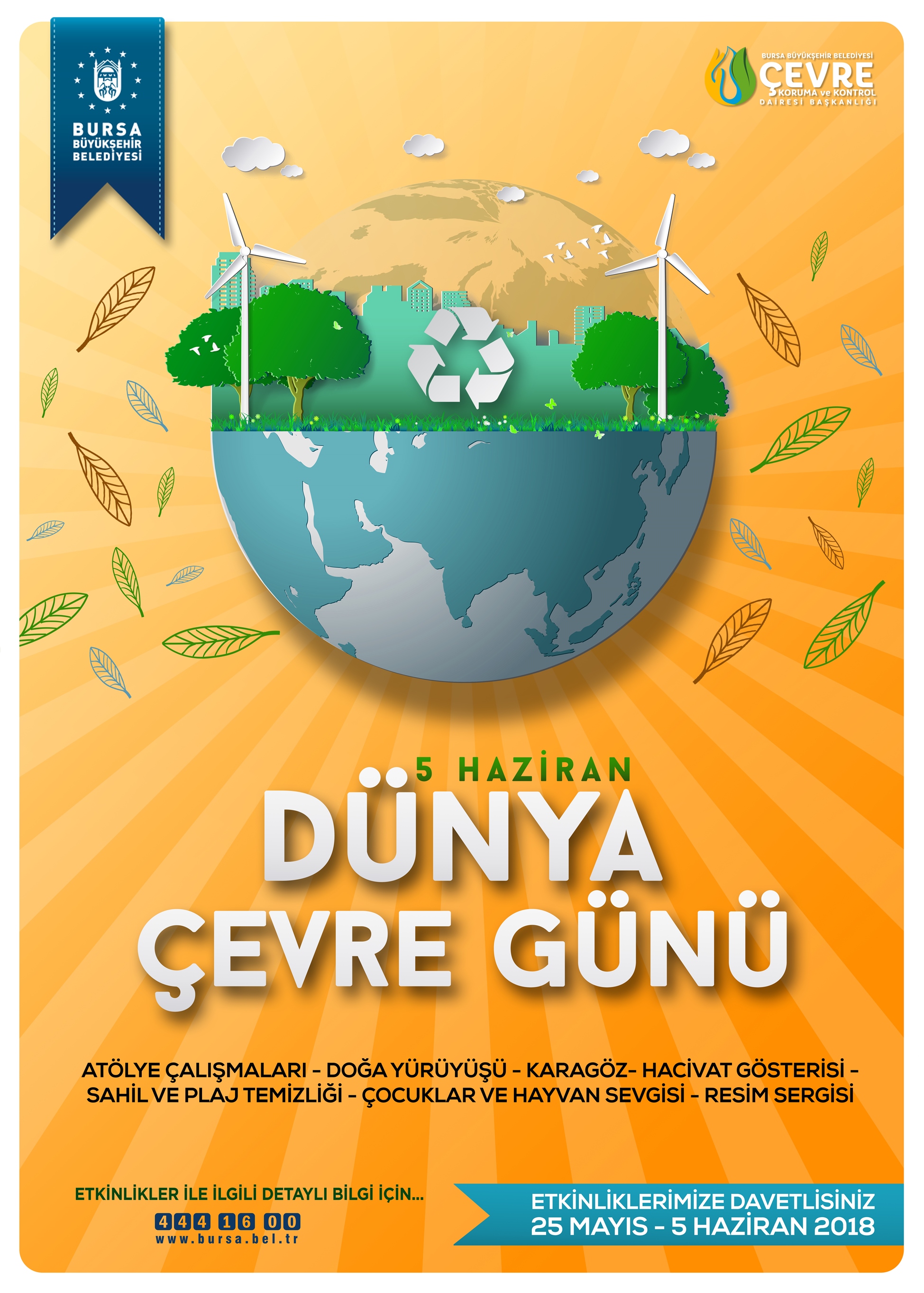 ‘Dünya Çevre Günü Etkinlikleri’ programı kapsamında ilk olarak 25 Mayıs Cuma günü Merinos AKKM Hüdavendigar Salonu’nda çevre temalı ‘Karagöz-Hacivat’ gösterisi sahnelenecek. 28 Mayıs Cumartesi günü saat 11:00’da Kumla merkezde plaj temizliği yapılacak. 29 Mayıs Pazar günü ise Bursa Kent Konseyi Koza Salonu’nda ‘Küresel ısınma ve iklim değişikliği’ konulu bilgilendirme toplantısı düzenlenecek. 30 ve 31 Mayıs tarihlerinde ise Hamitler Çocuk ile Alacahırka Gençlik ve Çocuk merkezlerinde miniklere yönelik çevre eğitimleri verilecek. 28 Mayıs ve 3 Haziran tarihlerinde iki seans halinde Hayvanat Bahçesi’nde ‘Çocuklar ve hayvan sevgisi’ temalı program icra edilecek. 2 Haziran Cumartesi günü Fomara Meydanı’nda ‘İzcilik Branşı Çevre Haftası’ etkinlik programı düzenlenecek. Yine aynı gün Gemlik merkezde ‘Dalgıçlarla dip temiz temizliği ve atık sergisi’ izlenime sunulacak. 2-3 Haziran tarihlerinde ise Bursa Bilim ve Teknoloji Merkezi’nde ‘planetaryom gösterisi, çocuk ve aile faaliyetleri, bilimsel atölye, yenilenebilir enerji temalı tur, tematik atölye, minik mucitler gibi’ çeşitli programlar düzenlenecek. 3 Haziran Pazar günü Tayyare Kültür Merkezi’nden hareket edilerek, Uludağ Cennet Parkuru’nda doğa yürüyüşü yapılacak. 4 Haziran Pazartesi günü ise Tayyare Kültür Merkezi Cemal Nadir Güler Sanat Galerisi’nde ‘Dünya Çevre Günü’ temalı resim sergili izlenime açılacak. Sergi, 9 Haziran’a kadar ziyaret edilebilecek. Ayrıca 28 Mayıs’ta Ali Paşa Oyuncak, 30 Mayıs’ta Lala Şahin Paşa ve 31 Mayıs’ta Hançerli Medresesi kütüphanelerinde ‘Geri dönüşüm atölyesi’ etkinliği yapılacak. 29 Mayıs ve 1 Haziran tarihleri arasında ise Enerji Müzesi’nde atölye çalışmaları yapılacak.