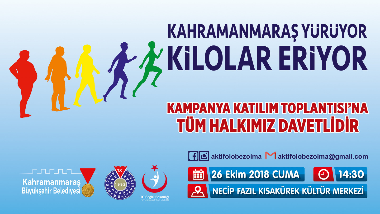 Büyükşehir Belediyesi son olarak Sütçü İmam Üniversitesi ve Sağlık İl Müdürlüğüyle ortaklaşa çalışma gerçekleştirerek bir kampanya düzenledi. “Sağlıklı beslen hareket et obez olma” ve “Kahramanmaraş yürüyor kilolar eriyor” sloganları ile Kahramanmaraş’ta obeziteye karşı farkındalık oluşturmak üzere düzenlenen kampanya için 26 Ekim Cuma günü saat 14.30’da Necip Fazıl Kısakürek Kültür Merkezinde bir tanıtım toplantısı gerçekleştirilecek.