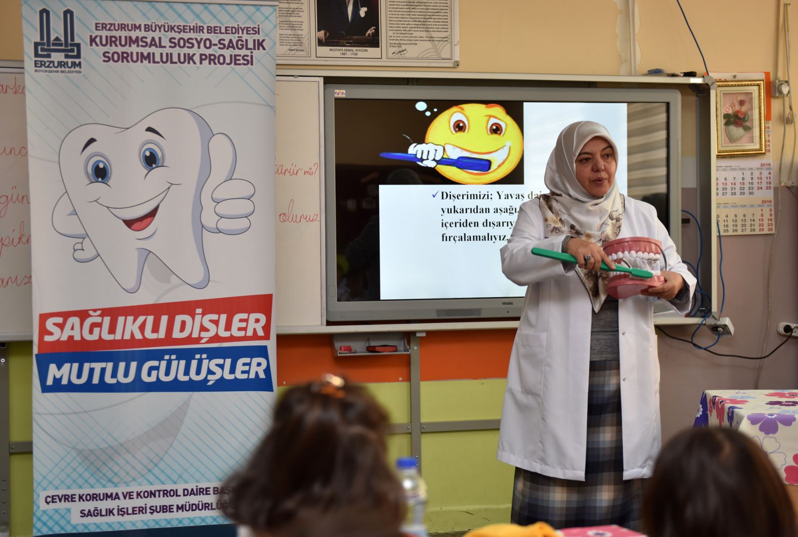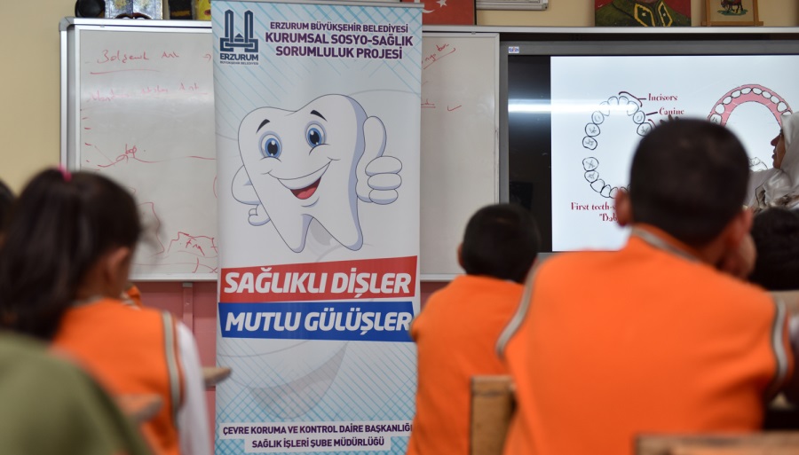 Erzurum Büyükşehir Belediyesi Çevre Koruma ve Kontrol Daire Başkanlığı Sağlık Şube Müdürlüğü ekipleri, “Sağlıklı dişler, mutlu gülüşler” adlı proje kapsamında il genelindeki eğitim kurumlarında ağız ve diş sağlığı taramasına başladı. Sağlık Şube Müdürü Funda Filiz Kocamangil’in yönetimindeki sağlık ekipleri, İlkokul 2 ve Ortaokul 1’nci sınıf öğrencilerine diş sağlığı konusunda bilgi verip, Büyükşehir Belediyesi’nin ağız ve diş sağlığı bakım setini hediye etti. 1071 Malazgirt İlk ve Ortaokulu öğrencilerine sağlık ekiplerince diş bakımıyla ilgili sunum yapıldı. 7 ay sürecek proje kapsamında 7 bin 500 öğrencinin ağız ve diş sağlığı taramasından geçirilmesi hedefleniyor. Konuyla ilgili değerlendirmede bulunan Yetkililer, “Erzurum Büyükşehir Belediye Başkanımız Mehmet Sekmen’in direktifiyle oluşturulan bu proje kapsamında il genelindeki 45 okulda sağlık taraması yapacağız. Mayıs ayında sona erecek olan proje kapsamında 7 bin 500 öğrencimiz ağız ve diş sağlığı taramasından geçirilecek ve tarama yapılan her bir öğrenciye ağız ve diş sağlığı bakım seti hediye edilecek” dedi.