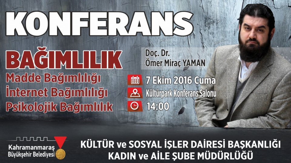Büyükşehir Belediyesi Kültür ve Sosyal İşler Dairesi Başkanlığı Kadın ve Aile Şube Müdürlüğü’nce Kültürpark Konferans Salonu’nda gerçekleştirilecek bağımlılık konferansına Doç. Dr. Ömer Meriç Yaman katılacak.
