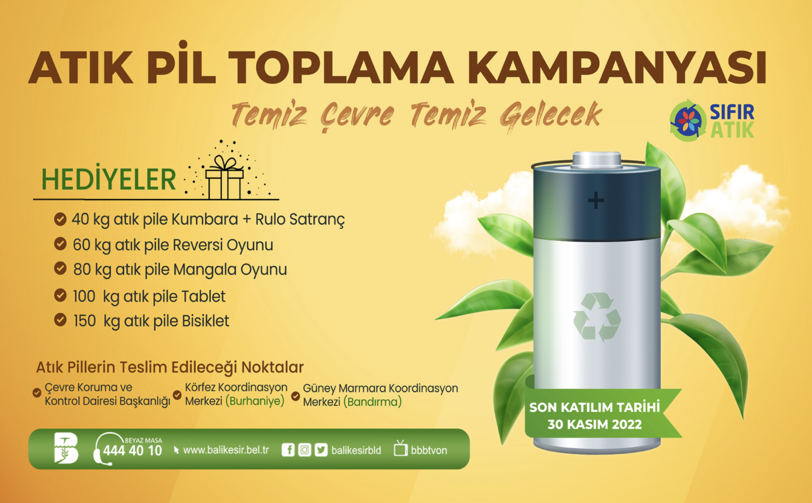 Balıkesir Büyükşehir Belediyesi, ‘Temiz Çevre Temiz Gelecek’ sloganıyla ödüllü atık pil toplama kampanyası başlattı. Tablet ve bisiklet gibi ödülleri kazanmak isteyenler 30 Kasım 2022 tarihine kadar toplama noktalarına pilleri ulaştırması gerekiyor.