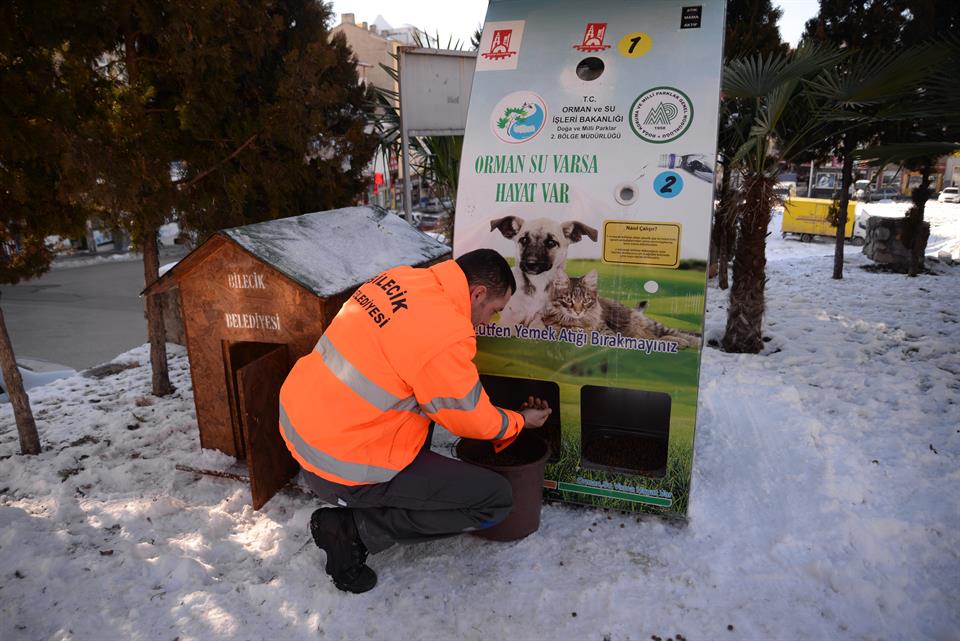 Bilecik Belediyesi Sokak Hayvanları Tedavi ve Rehabilitasyon Merkezi’nde can dostlarımızı en iyi şekilde ağırlayan Veteriner İşleri Müdürlüğü ekipleri, kulübelere mama ve su bıraktı.