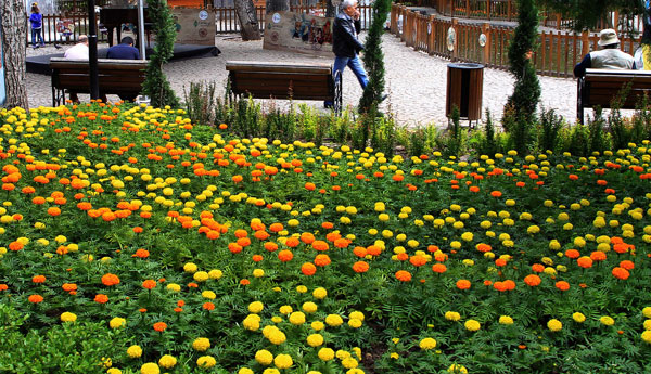 Özellikle farklı renklerde olan Horoz İbiği, Yıldız ve Kadife çiçekleriyle bezenen parklar, gerekli yerlerde çalı grubu bitkilerle de destekleniyor.