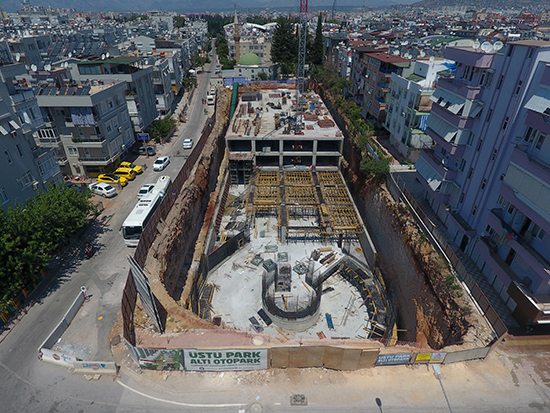 Antalya Büyükşehir Belediyesi’nin Şarampol Projesi kapsamında üstü park altı otopark olarak projelendirdiği Cumhuriyet Mahallesi Yeraltı Katlı Otoparkı hızla yükseliyor.