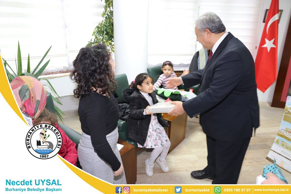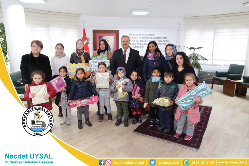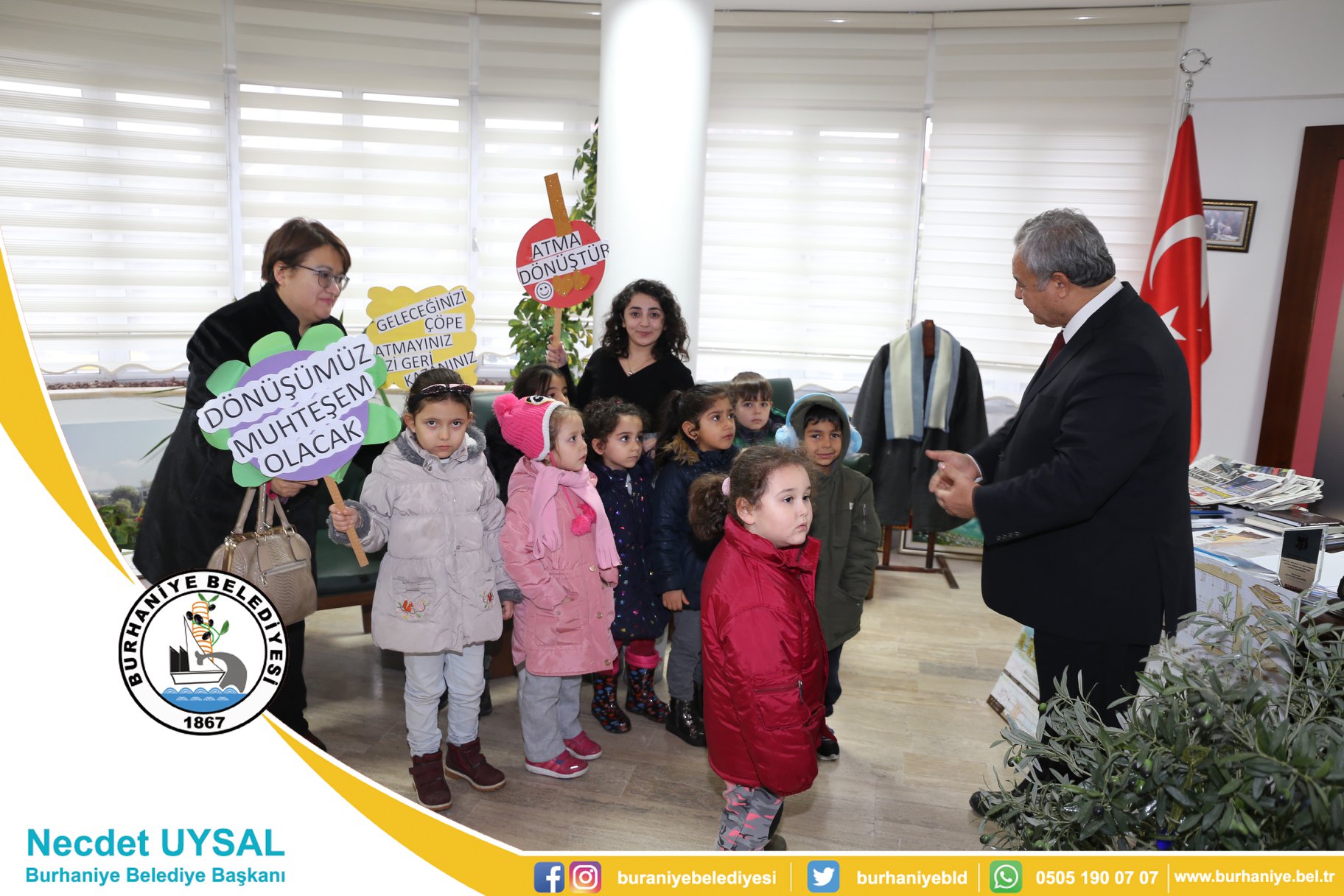 Minikleri daha sonra makamında ağırlayan Burhaniye Belediye Başkanı Necdet Uysal küçüklere çevre temizliği ve geri dönüşüm konusunda yaptıkları büyük davranış için teşekkür etti ve kendilerine oyuncak hediye etti. Minik öğrencilere “sizlere daha iyi bir gelecek sağlayabilmemiz için bizler çevre temizliği ve geri dönüşüm konusunda elimizden gelen faaliyeti ve çalışmayı sürdürüyoruz. Ancak bu konuda bir tek bizlerin çalışması yetmez. Toplumumuzda yaşayan herkesin çevreyi temiz tutması lazım ve çöplerini ayrıştırmanın önemini bilmesi lazım. Bu anlamda sizin yaptığınız bu davranış çok önemli ve çoğu büyüğünüze örnek olacak bir davranış ben hepinize ayrı ayrı teşekkür ediyorum” dedi.
