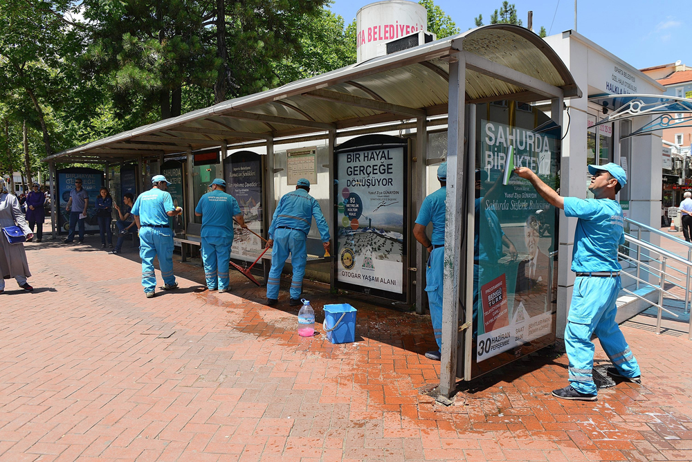 Isparta Belediye Başkanı Yüksek Mimar Yusuf Ziya Günaydın’ın talimatları doğrultusunda devam eden çalışmalar kapsamında Temizlik İşleri Müdürlüğü ekipleri öncelikli olarak şehir merkezinde çalışmalarını devam ettiriyor. Bu kapsamda Kaymakkapı Meydanı ana otobüs durakları ile 6 Mart Caddesi üzerinde bulunan üniversite durakları başta olmak üzere tüm duraklar elden geçiriliyor. Duraklar ve oturma gurupları sabunlu su ile yıkanırken, ardından kurulama çalışması gerçekleştiriliyor. Durak camlarına asılmış olan afiş ve benzeri duyurularda kaldırılıyor.
