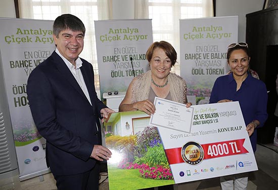 Büyükşehir Belediyesi’nin 5 ayrı kategoride düzenlediği “En Güzel Bahçe ve Balkon” yarışmasında ödül heyecanı yaşandı. Sonuçları geçtiğimiz hafta Başkan Menderes Türel tarafından açıklanan yarışmada ilk üçe girenler ödüllerini aldı. EXPO 2016 fuar alanında düzenlenen ödül törenine Büyükşehir Belediye Başkanı Menderes Türel, AK Parti Antalya Milletvekili Gökçen Enç, AK Parti İl Başkanı Rıza Sümer ve çok sayıda EXPO 2016 Antalya ziyaretçisi katıldı.