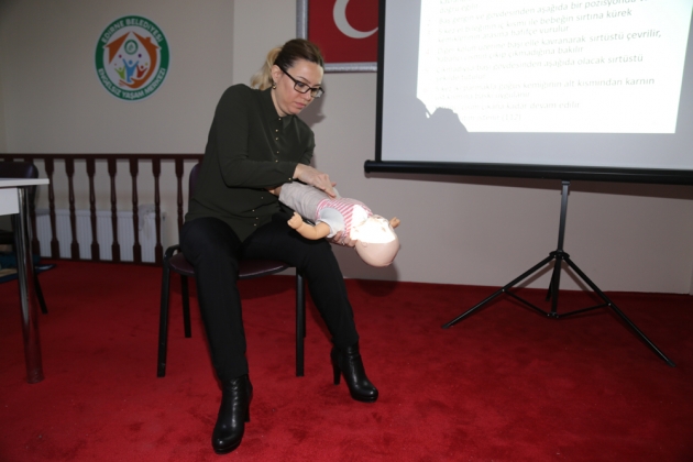 Daha sonra ilk yardım eğitmenleri Ayten Sünetçiler ve İnci Özer ise aileleri Temel Yaşam Desteği ve İlk Yardım konusunda uygulamalı olarak bilgilendirdi.