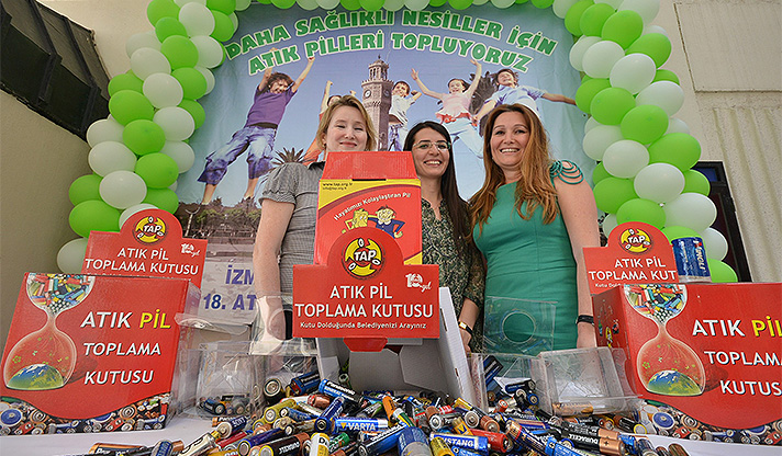 İzmir Büyükşehir Belediyesi’nin Taşınabilir Pil Üreticileri ve İthalatçıları Derneği (TAP) ve ilçe belediyeleri işbirliğinde düzenlediği ve her yıl yeni bir rekorun kırıldığı ‘Atık Pil Toplama’ kampanyasında yeni heyecan başladı. Kampanyaya katılmak isteyen çevre dostlarının, yıl boyunca topladıkları kullanılmış pilleri 30 Mayıs–2 Haziran tarihleri arasında Alsancak Gündoğdu Meydanı’nda kurulacak stanttaki kumbaralara atabileceği bildirildi. Tartımlar sonucunda yetişkinler, gençler, çocuklar, okullar, sivil toplum kuruluşları ve kurumlar, anaokulları, muhtarlıklar, ilçe belediyeler ve sokak çocukları ödülü olmak üzere, 9 kategoride dereceye girenlere ödülleri, 4 Haziran 2016 günü 18.00–19.00 saatleri arasında Gündoğdu Meydanı’nda verilecek. Çevre dostları notebook, tablet bilgisayar, masaüstü bilgisayar, akıllı cep telefonu, LCD televizyon, interaktif dokunmatik akıllı tahta ve okul çantası seti gibi ödüllerin sahibi olacak.