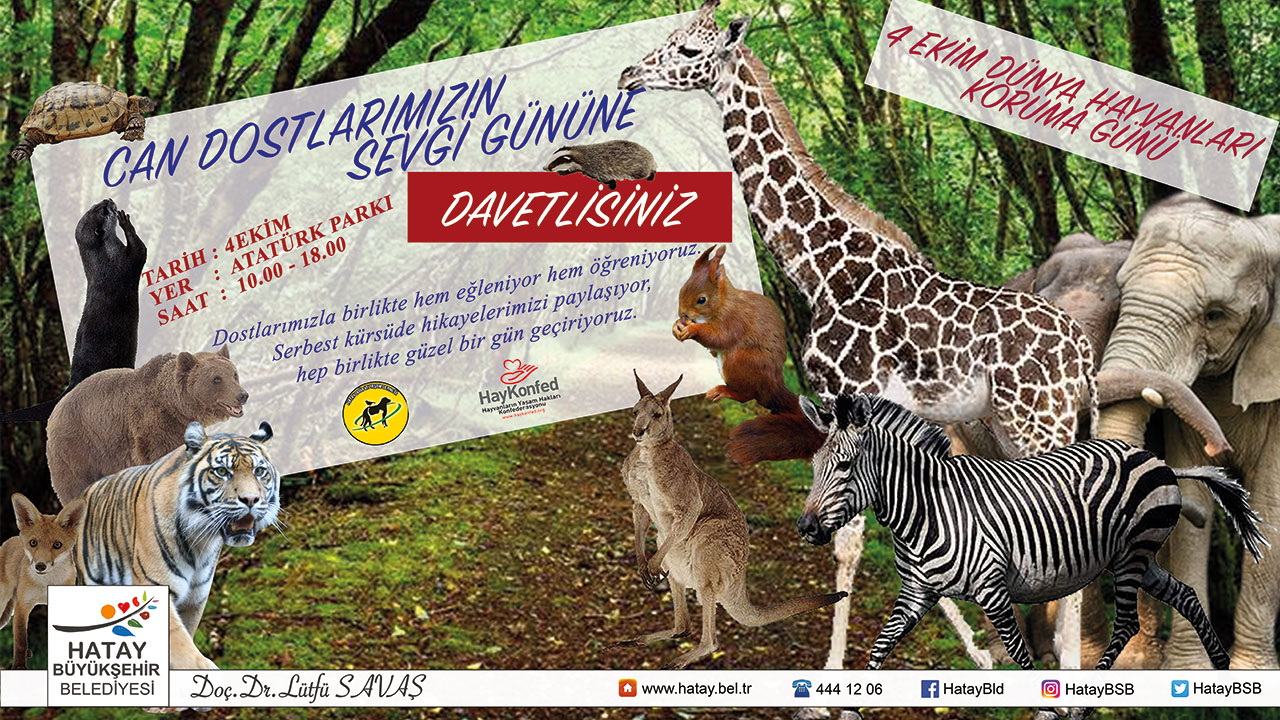 Hatay Büyükşehir Belediyesi, Haykonfed (Hayvanların Yaşam Hakları Konfederasyonu) ve Hatay Doğa ve Yaşam Derneği işbirliği ile 4 Ekim Salı günü Dünya Hayvanları Koruma Günü dolayısıyla Antakya Atatürk Parkı’nda ‘Can Dostlarımızın Sevgi Günü’ adı altında etkinlik düzenlenecek.