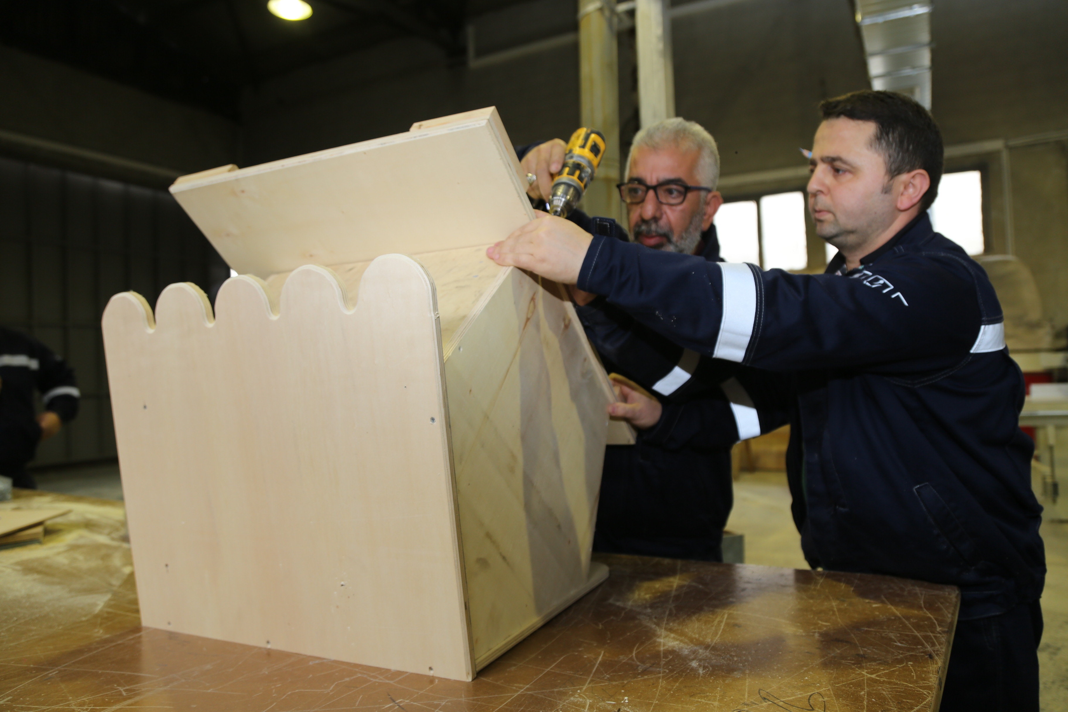 Kültür Daire Başkanlığı Şehir Tiyatroları Müdürlüğü bünyesinde sahnelenen oyunlar için özel üretilen sahne dekorlarından kullanılamayacak durumdaki malzemeler İBB’ye ait Cemil Topuzlu Açık Hava Tiyatrosu’nun yanındaki atölyelere gönderiliyor. Tahta, sunta, demir, kostüm, takı gibi malzemeler boyahane, marangozhane, terzihane gibi 11 atölyede “Sıfır Atık Projesi” kapsamında yeniden değerlendiriliyor. Bu kapsamda sahne dekorlarından arta kalan tahta ve suntaların, havaların soğuması nedeniyle candostlarımıza yuvaya dönüştürülmesi için çalışma başlatıldı. Marangozhane ustalarının özgün tasarımıyla tahta ve suntalardan bugüne kadar 15 tane kedi evi yapıldı. Marangozhaneden çıkan kedi evleri boyahaneye gönderilerek atık boyalardan oluşan yeşil, kahverengi ve turuncu renk ile boyanarak hazır hale getirildi.