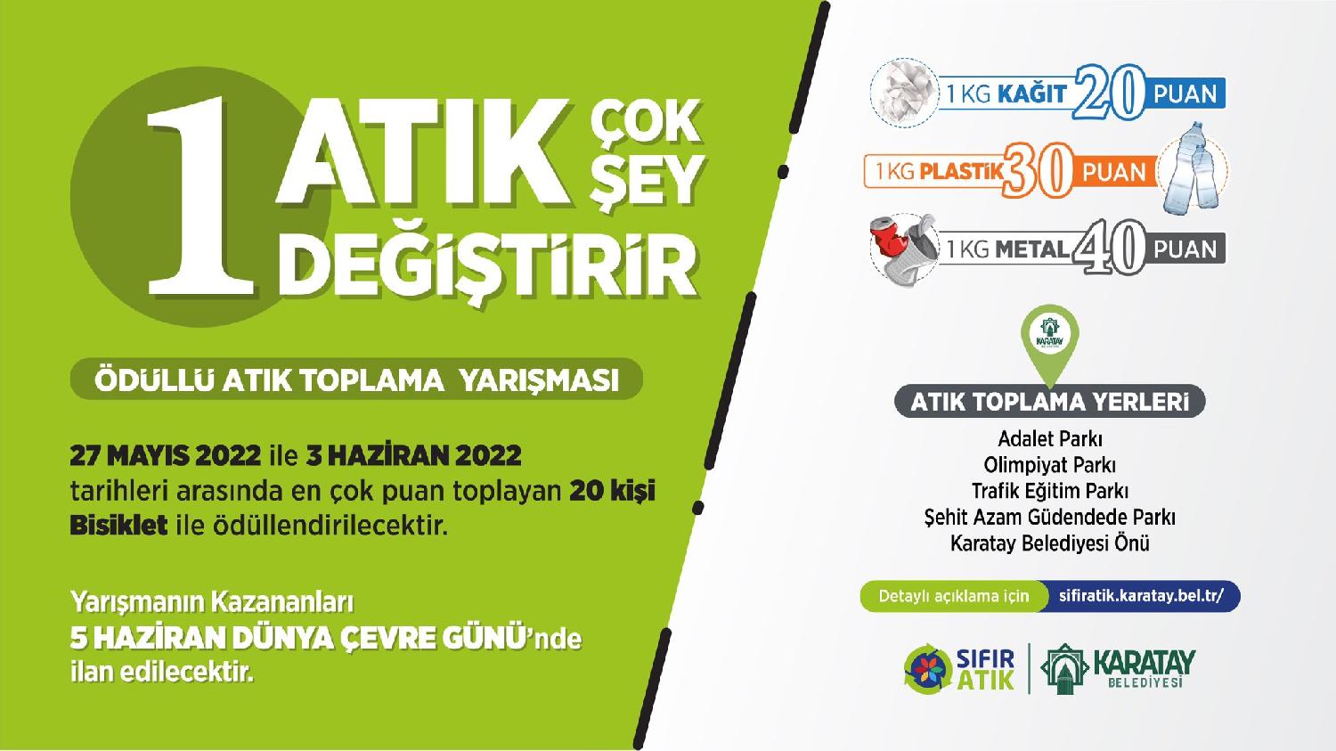 Çevre, Şehircilik ve İklim Değişikliği Bakanlığı tarafından yürütülen “Sıfır Atık Projesi”ni en fazla destekleyen belediyeler arasında bulunan Karatay Belediyesi, doğal kaynakları korunan, çok daha sağlıklı ve temiz bir Karatay hedefiyle “1 Atık Çok Şey Değiştirir” adlı bir yarışma düzenledi. Yarışma kapsamında 3 Haziran Cuma gününe kadar en fazla atık getiren 20 kişi bisikletle ödüllendirilecek. Karatay Belediye Başkanı Hasan Kılca, sosyal medya hesaplarından duyurduğu yarışmaya tüm Karataylıları davet ederek; “Kıymetli hemşehrilerim, Sıfır Atık ve Geri Dönüşüm çalışmalarımızda sizlerin hassasiyetiyle ulaştığımız başarıyı 5 Haziran Dünya Çevre Günü’nde ödüllendiriyoruz” ifadelerini kullandı.