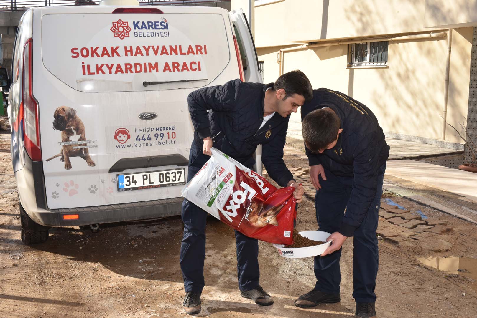 Kedi ve köpek evleri ile sokaktaki sahipsiz hayvanlara sıcak bir yuva kuran Karesi Belediyesi, ‘Sokak Hayvanları İlk Yardım Aracı’ ile zorlu kış şartlarında yiyecek bulmakta zorlanan sokak hayvanlarına da son üç ayda 1.5 ton kuru mama dağıtımı yaptı.