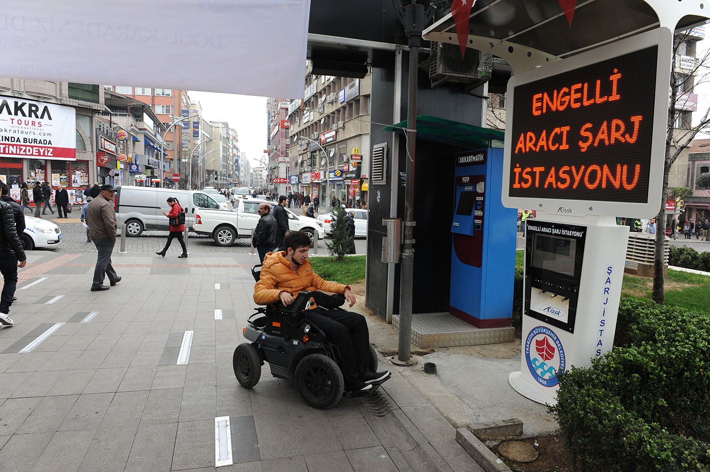 Gerçekleştirdiği sosyal çalışmalarla takdir toplayan Trabzon Büyükşehir Belediyesi, engelli vatandaşların sosyal hayata daha fazla katılımlarını sağlamak için çalışmalarını sürdürüyor. Büyükşehir Belediyesi bu kapsamda Trabzon’un en işlek noktalarının başında gelen Ortahisar ilçesindeki Atatürk Alanı’na (Meydan Parkı) engelli aracı şarj istasyonu kurdu. Böylece akülü araç kullanan engelli vatandaşlar, şehir merkezinde araçlarını şarj ederek sosyal hayata daha fazla katılma şansı elde etti.