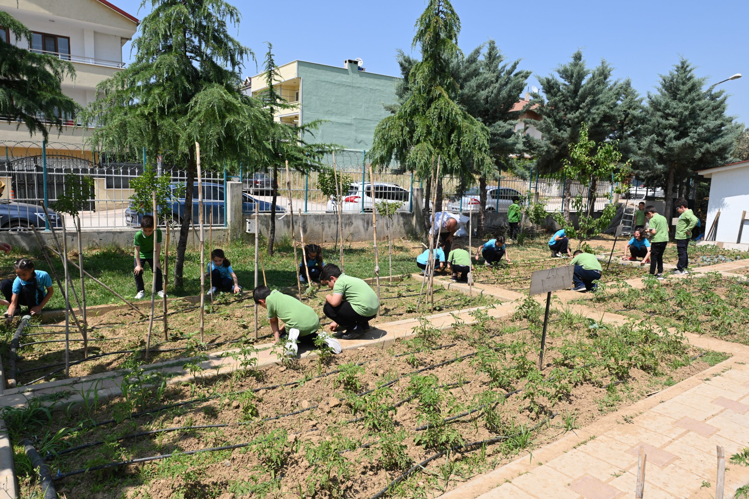 Başkan Alinur Aktaş, daha sonra öğrencilerle birlikte hobi ve hayvan bakım bahçesine sebze fidelerini ekti.
