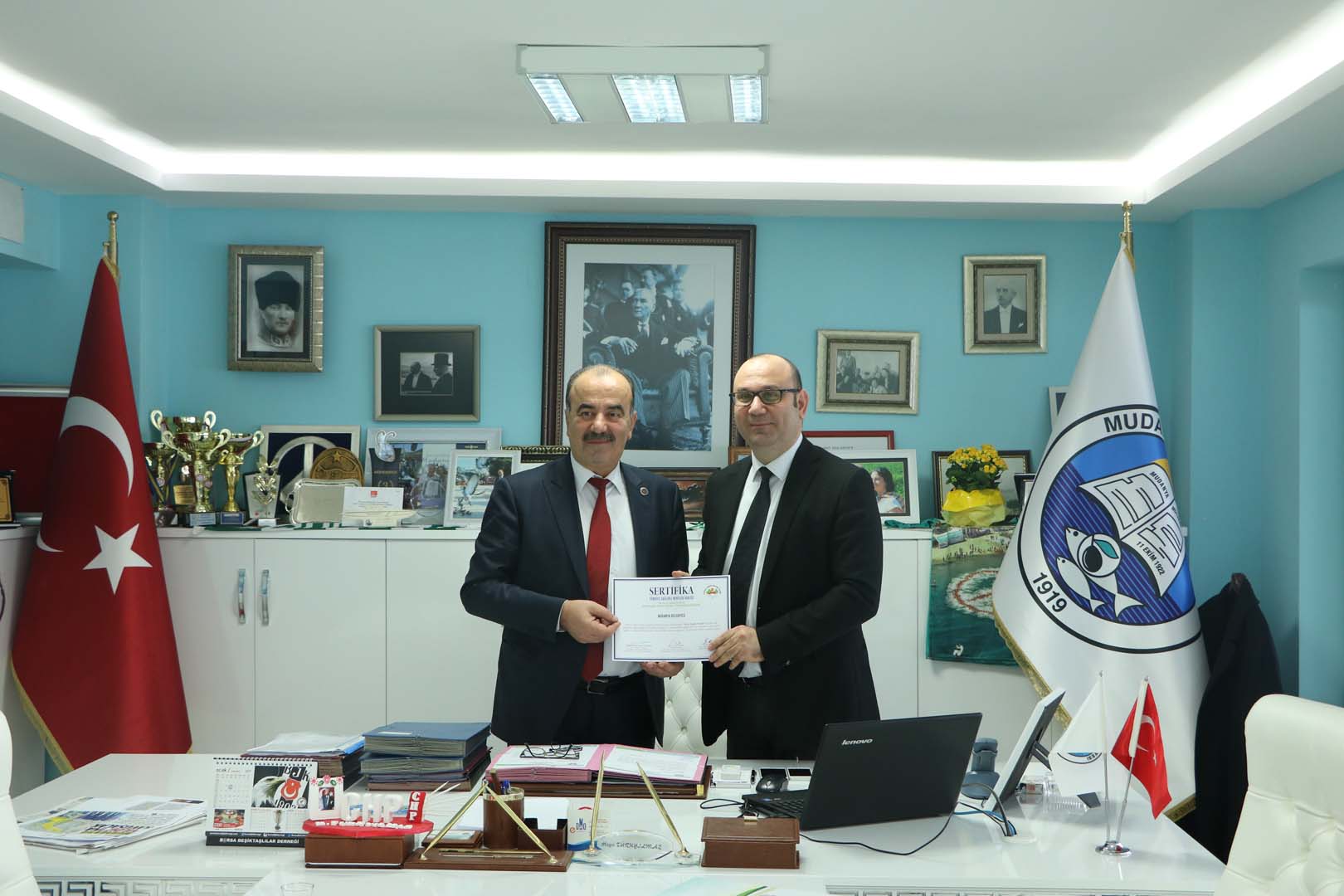 Birlik müdürü Murat Ar’ın Birlik çalışmaları hakkında yaptığı sunumun ardından Başkan Türkyılmaz Birlik çalışmalarından beklentilerini ve önerilerini dile getirdi. Mudanya Belediyesi’nin şehir sağlık profilini hazırlayan üye belediyeler arasında yer almasından dolayı Başkan Türkyılmaz’a sertifikasını takdim ederek çalışmalarımıza verdiği destekten dolayı teşekkür ettik.
