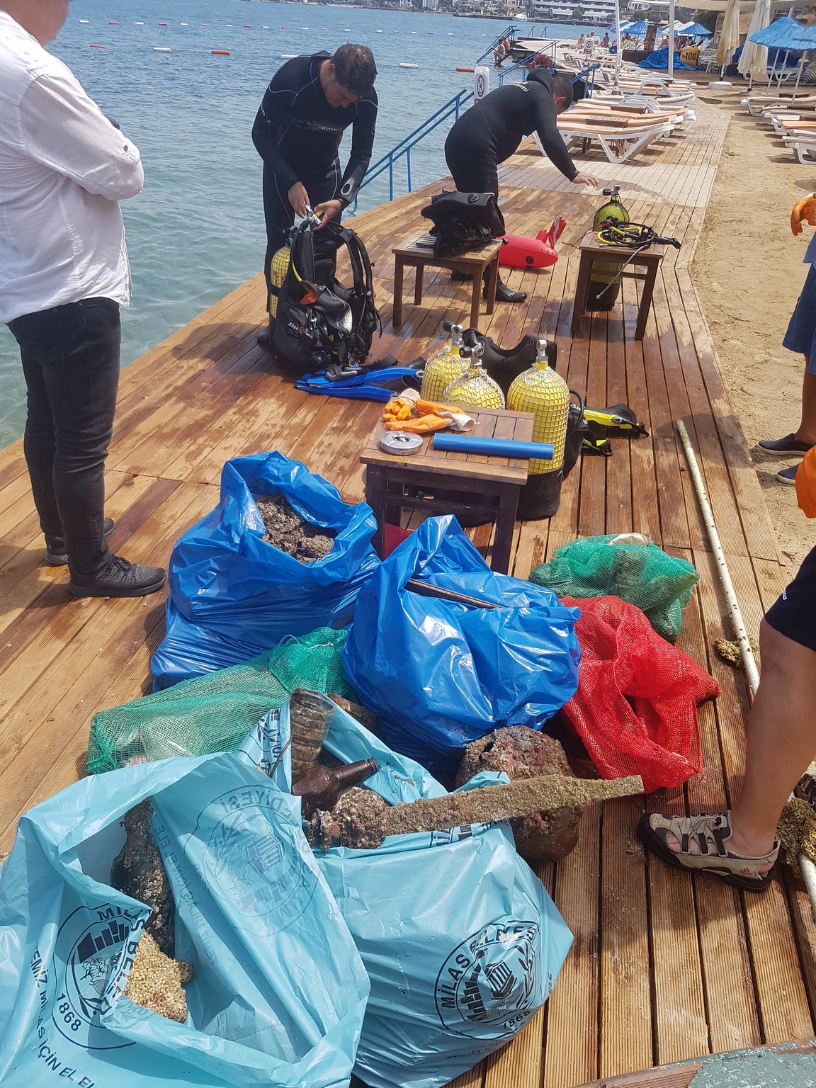 Büyükşehir Belediyesi dalgıçlarının da destek verdiği etkinlikte denizden cam, teneke ve pet şişe gibi çeşitli atıklar çıkartıldı.