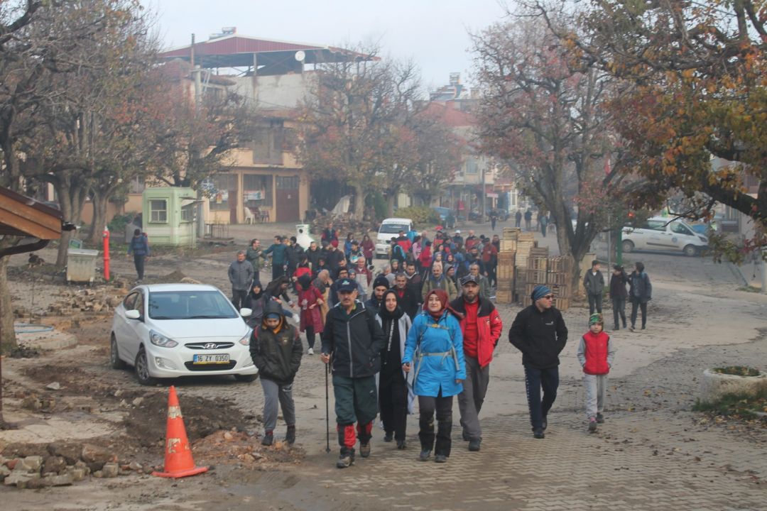 Sabah 08.30’da İnegöl Belediyesi Gençlik Merkezi önünde toplanan doğaseverler, 8 kilometrelik Babasultan-Akıncılar-Yeniceköy parkuru için buradan otobüslerle yola çıktı. Babasultan köyünde araçlardan inilerek yürüyüşe geçildi. Kolay parkurda sonbaharın son güneşli günlerinin keyfini doyasıya yaşayan doğaseverler, yürüyüşe geçmeden önce Geyikli Baba türbesini ziyaret etti. Ardından Akıncılar Mahallesine doğru yürüyüşe başlandı. Babasultan ile Akıncılar arasındaki 3 kilometrelik yolu 45 dakikada yürüyen ekip, rotanın kısa olması nedeniyle özellikle ağır olarak ilerleyerek sonbaharın sunduğu renk cümbüşünü doyasıya izleme imkanı buldu. Akıncılar Mahallesinde verilen 20 dakikalık mola sonrası Yenice mevkiine doğru harekete geçildi. Orman yollarından yapılan yürüyüş sırasında zaman zaman yoldan ayrılarak tarlalara inen grup, tarla kenarından yürüyerek Yeniceköy sırtından gölete ulaştı.