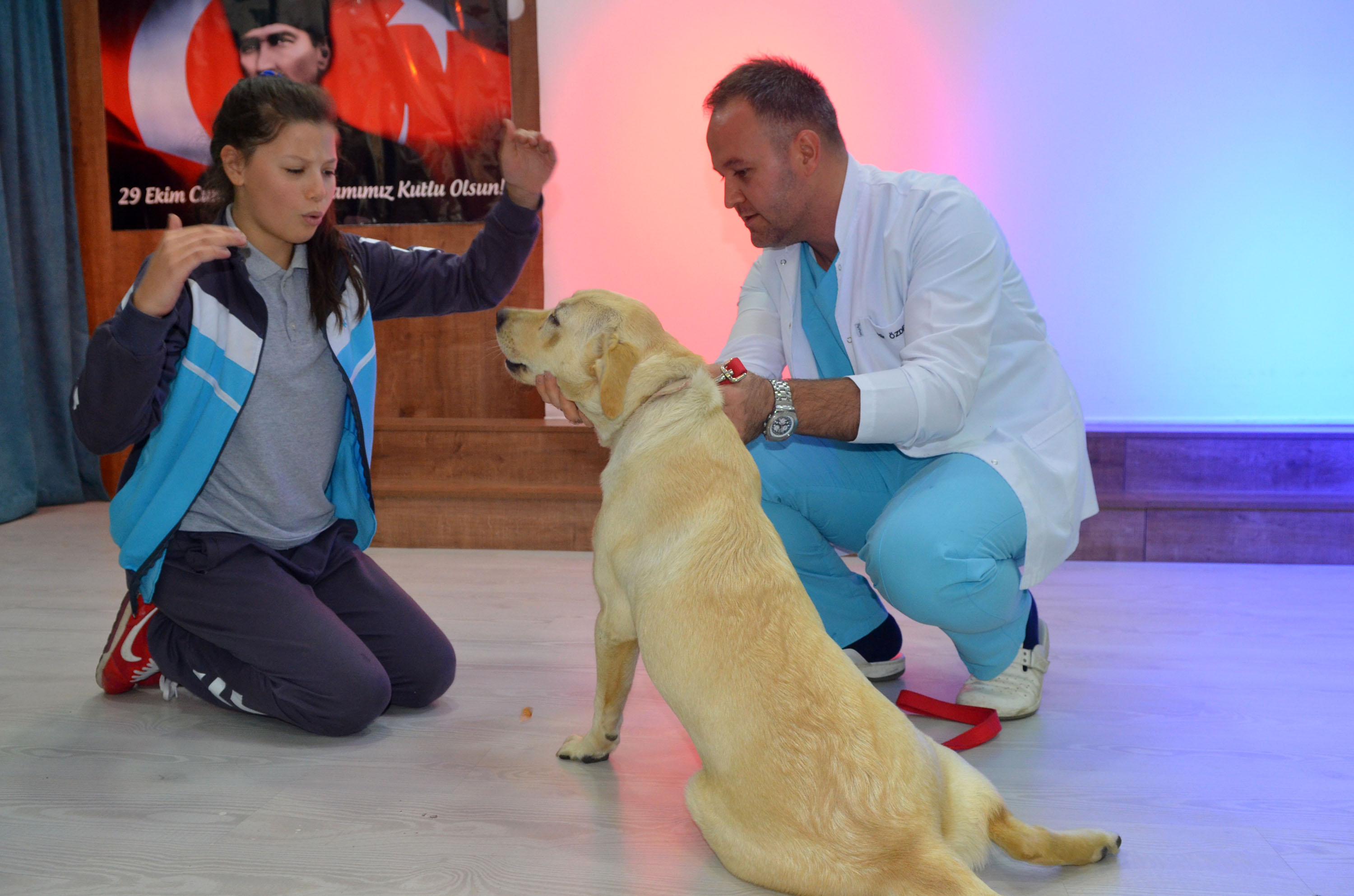 Daha sonra söz alan Veteriner Hekim Kadir Özdemir de çocukların hayvanlarla iletişimini ölçmek ve hayvanlara karşı duyarlılık tespiti yapmak amacıyla çeşitli sorular sorarak interaktif bir sunum gerçekleştirdi. Özdemir, öğrencilerin birbirinden farklı sorularına yanıt vermenin yanında hayvan sahiplenme konusunda da bilgi verdi. Özdemir, “Barınağımızdaki hayvanların her biri bakımları ve aşıları yapılmış, son derece sağlıklı hayvanlar. Evinde kedi ya da köpek bakmak isteyen vatandaşlarımız, uygun şartları taşımaları halinde seçtikleri hayvanı ücretsiz olarak sahiplenebiliyor” dedi. Özdemir, daha sonra sahneye getirilen “Arya” isimli Labrador cinsi köpeği, ilk olarak köpek korkusu olan öğrencilerden başlayarak dokunup sevmelerine izin verirken, öğrenciler de hayvan sevgisini uygulamalı olarak yaşama fırsatı buldu.