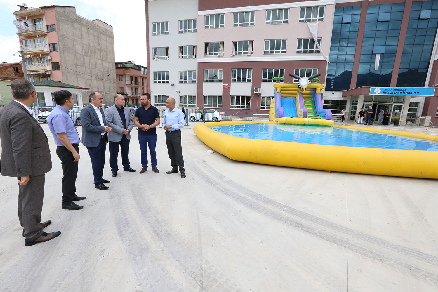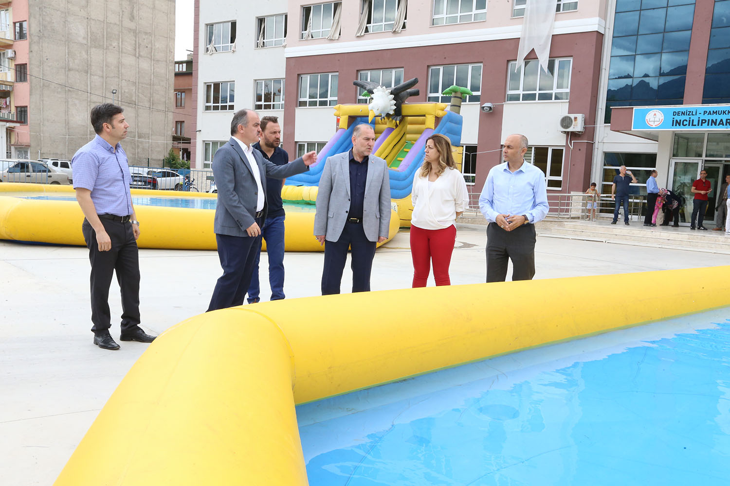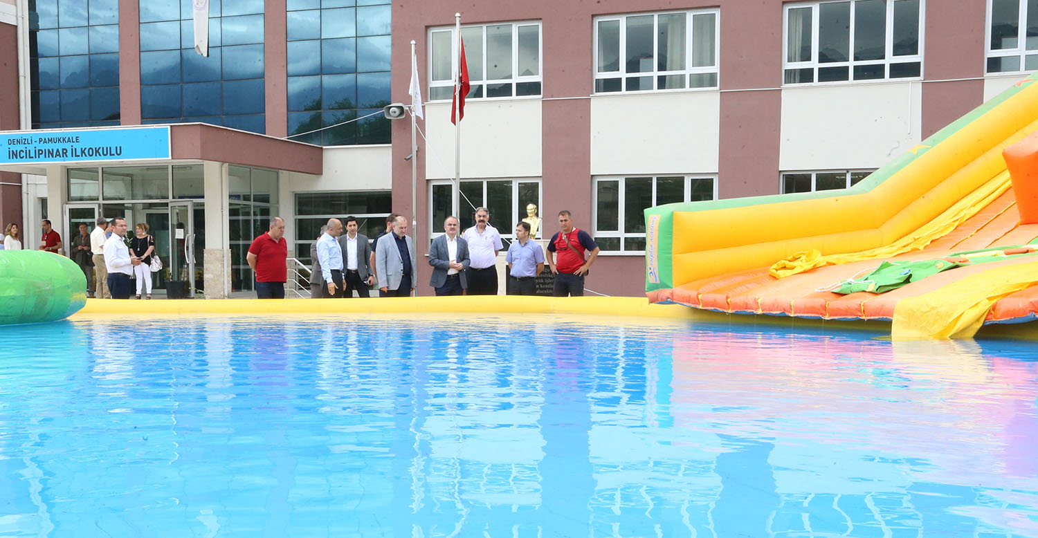 Pamukkale Belediyesi “Yüzmeyi Öğrenmeyen Kalmasın, Haydi Çocuklara Havuza” diyerek, çocuklara yönelik yepyeni bir proje hazırladı. Eğitim-öğretim yılı içerisinde öğrencilere, okullara desteğini hiç eksiltmeyen Pamukkale Belediyesi yaz döneminde öğrencilerin yanında olacak. Çocukların yaz tatillerini daha verimli geçirmeleri için hazırlanan projenin müjdesini geçtiğimiz günlerde veren Pamukkale Belediye Başkanı Hüseyin Gürlesin, kurulumu tamamlanan İncilipınar İlköğretim Okulu’ndaki havuzda incelemelerde bulundu. “Pamukkale Belediyemizin yazı değerlendirmek amacıyla hazırladığı yüzme havuzlarımızın kurumlarına başladık” diyen Başkan Gürlesin, “Şu anda İncilipınar İlköğretim Okulu’ndayız. Yoğun bir eğitim öğretim yılı sonunda, çocuklarımıza, hem ödül anlamında hem de yüzmeyi öğrenmeleri noktasında eğlenceli bir etkinlik hazırladık. Pamukkale Belediyesi olarak bizler yapmış olduğumuz işlerin tamamında kaliteyi ön planda tutarken, artı eğlenceyi de dikkate alıyoruz” diye konuştu.