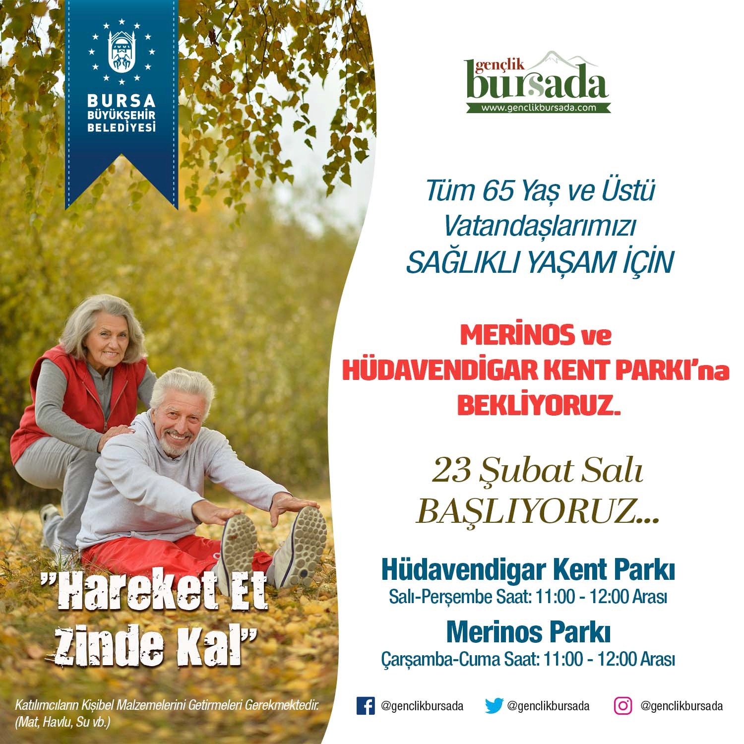 Risk grubunda oldukları için uzun süredir sokağa çıkma kısıtlaması olan bu nedenle de zamanlarının büyük bir bölümünü evlerinde geçirmek kalan 65 yaş ve üzeri vatandaşlar, bu proje ile uzman eğitmenler eşliğinde fizikler aktivitelerini artırmak için önemli bir fırsat yakalayacak. Alanında en iyi eğitmenlerle birlikte 23 Şubat 2021 tarihinde başlayacak etkinlikler Salı ve Perşembe günleri saat 11.00 – 12.00 arasında Hüdavendigar Kent Parkı’nda, Çarşamba ve Perşembe günleri de aynı saatlerde Merinos Park’ta yapılacak.
