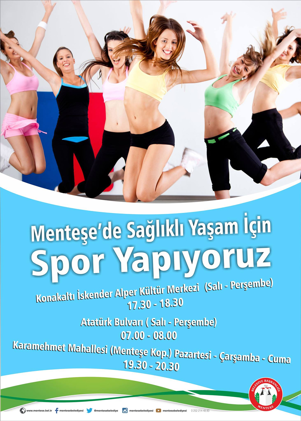 Menteşe Belediyesi “Sağlıklı Yaşam İçin, Spor Yapıyoruz” sloganı kapsamında yapılan egzersizler, Salı ve Perşembe günleri Saat: 07.00-08.00 arası Atatürk Bulvarı (Aydem Karşısı) , Salı ve Perşembe günleri 17.30 – 18.30 arası Konakaltı İskender Alper Kültür Merkezi, Pazartesi – Çarşamba ve Cuma günleri ise Saat: 19.30 – 20.30 arası Karamehmet Mahallesi Menteşe Kooperatiflerinin bulunduğu alanda yapılıyor.
