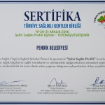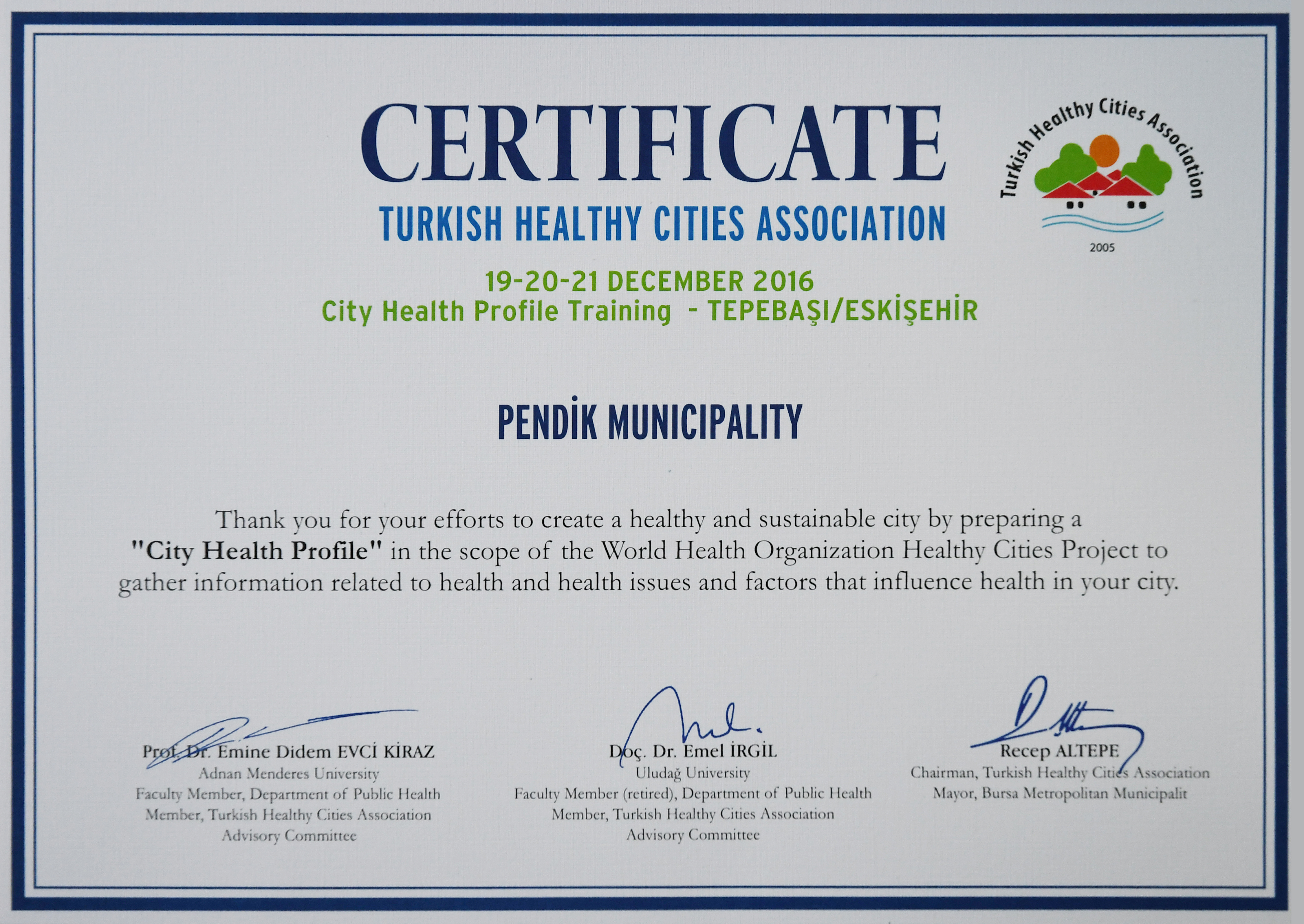 Sertifikada: “Dünya Sağlık Örgütü Sağlıklı Şehirler Projesi Kapsamında “Şehir Sağlık Profili” hazırlayarak şehrinizin sağlık bilgileri ile sağlık sorunlarını ve şehrinizdeki sağlığı etkileyen etmenleri tespit ederek sağlıklı ve sürdürülebilir bir kent olmak adına yapmış olduğunuz çalışmalardan dolayı teşekkür ederiz” ifadesine yer verildi.