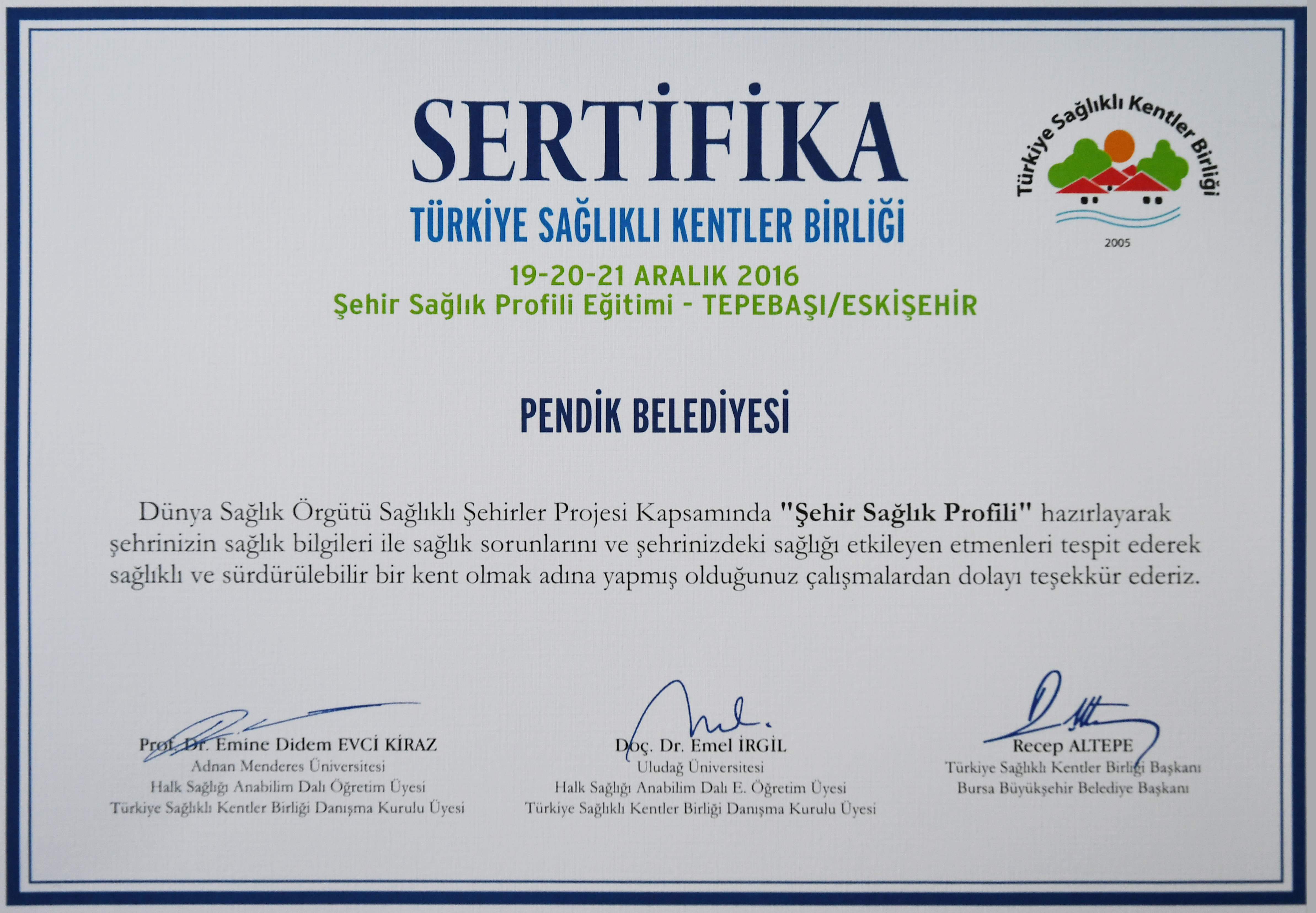 Daha sağlıklı ve sürdürebilir bir kent oluşturmak üzere Şehir Sağlık Profili çalışmasını tamamlayan Pendik Belediyesine Türkiye Sağlıklı Kentler Birliği tarafından sertifika verildi. Sertifika, Şehir Sağlık Profili Eğitimi’ne katılarak Pendik’teki deneyimi anlatan Başkan Şahin’e takdim edildi.