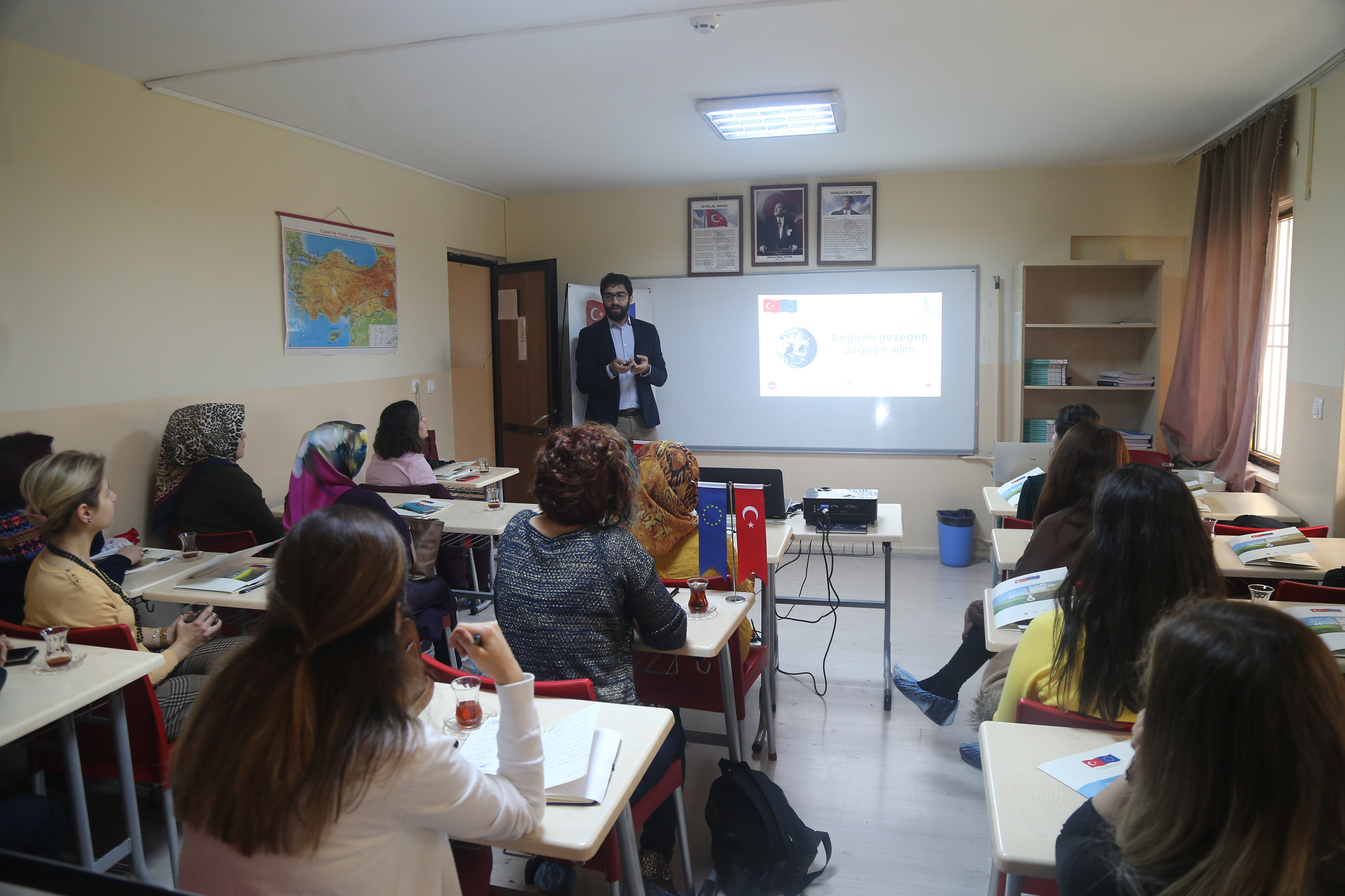 İklim Hareketi İçin Değişime Güç Ver projesi kapsamında ayrıca İbrahim Cinkaya Sosyal Bilimler Lisesi’nde öğrencilere güncel çevre sorunları ve iklim değişikliği konusunda farkındalıkları ve kapasitelerinin artırılması amacıyla eğitim düzenlendi. REC Türkiye Direktörü Rıfat Ünal Sayman, uzmanlar Onur Akpulat ve Dursun Baş’ın katıldığı eğitimlerin ikinci ayağı da Denizli Büyükşehir Belediyesi Atalar Sosyal Etkinlik Merkezi’nde gerçekleştirildi. Buradaki eğitimde de öğretmenlere yönelik çevre sorunları ve iklim değişikliği konularını derslerde nasıl işlemeleri hakkında çeşitli yöntemler anlatıldı.
