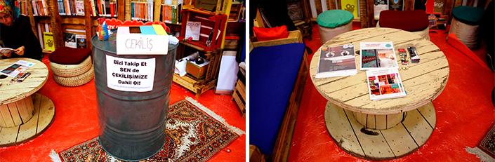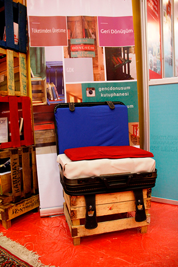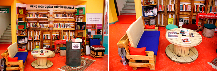 Genç Dönüşüm Kütüphanesi standında kullanılmayan ve atık eşyalardan dönüştürülen malzemeler bulunuyor. Kitapların bulunduğu raflar, pazarlarda atılan kasalardan oluşuyor. Ahşap makaralardan masanın, araba lastiklerinden taburelerin olduğu kütüphaneye uğrayan kitapseverler kitapları bir başka inceliyor. İlgiyle karşılanan kütüphane Kocaeli Kitap Fuarı süresince kitapseverlerin beğenisine sunuluyor.