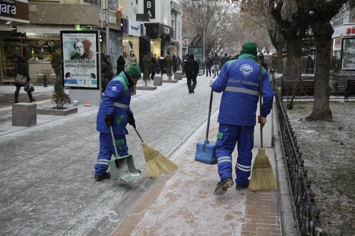 Dondurucu soğuk ve kara rağmen çalışmalarına aralıksız devam eden temizlik işçileri, Odunpazarı’nın cadde ve sokaklarını temizliyor. Bir taraftan sokak ve caddelerde tozu, çamur ve çöpleri süpüren temizlik işçileri, diğer taraftan da çöp yığınlarını topluyor.