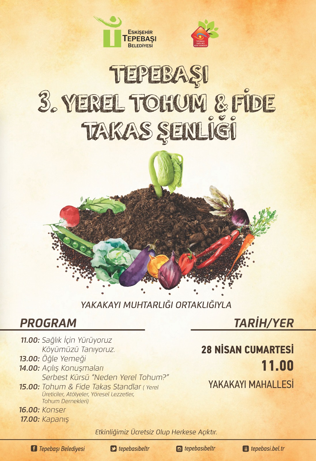 Eskişehir Tepebaşı Belediyesi’nin düzenlediği “3. Yerel Tohum-Fide Takas Şenliği” 28 Nisan 2018 Cumartesi günü Saat:11:00’da Yakakayı Mahallesinde yapılacaktır.