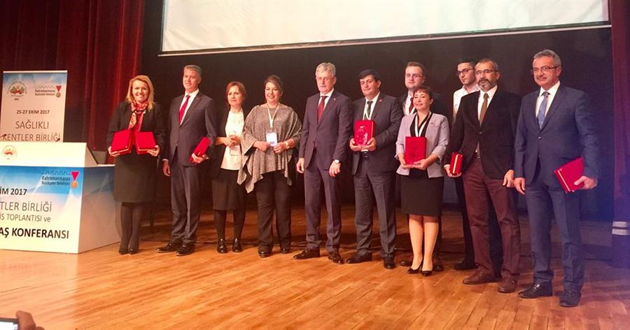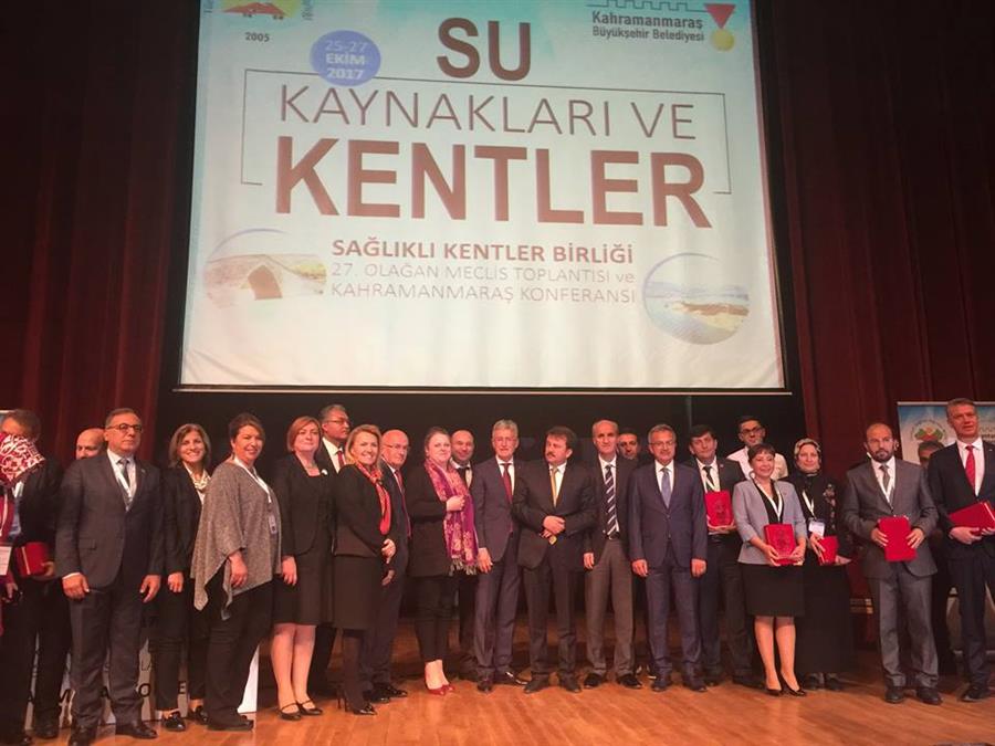 Türkiye Sağlıklı Kentler Birliği’nin “Su Kaynakları ve Kentler” konusunu ele aldığı 27. Olağan Meclis Toplantısı ve Konferansı’nın yapıldığı Mehmet Akif Kültür Merkezi’nde bir de tören düzenlendi. Birliğin 2017 yılına ilişkin şehircilik ödülleri içerisinde biri birincilik diğeri ise Toplum Temelli Oyun Odaları projesiyle Jüri Özel Ödülü’ne layık görülen Urla Belediye Başkanı Sibel Uyar, ödülünü Türkiye Sağlıklı Kentler Birliği Başkanvekili Mehmet Ellibeş’ten aldı.