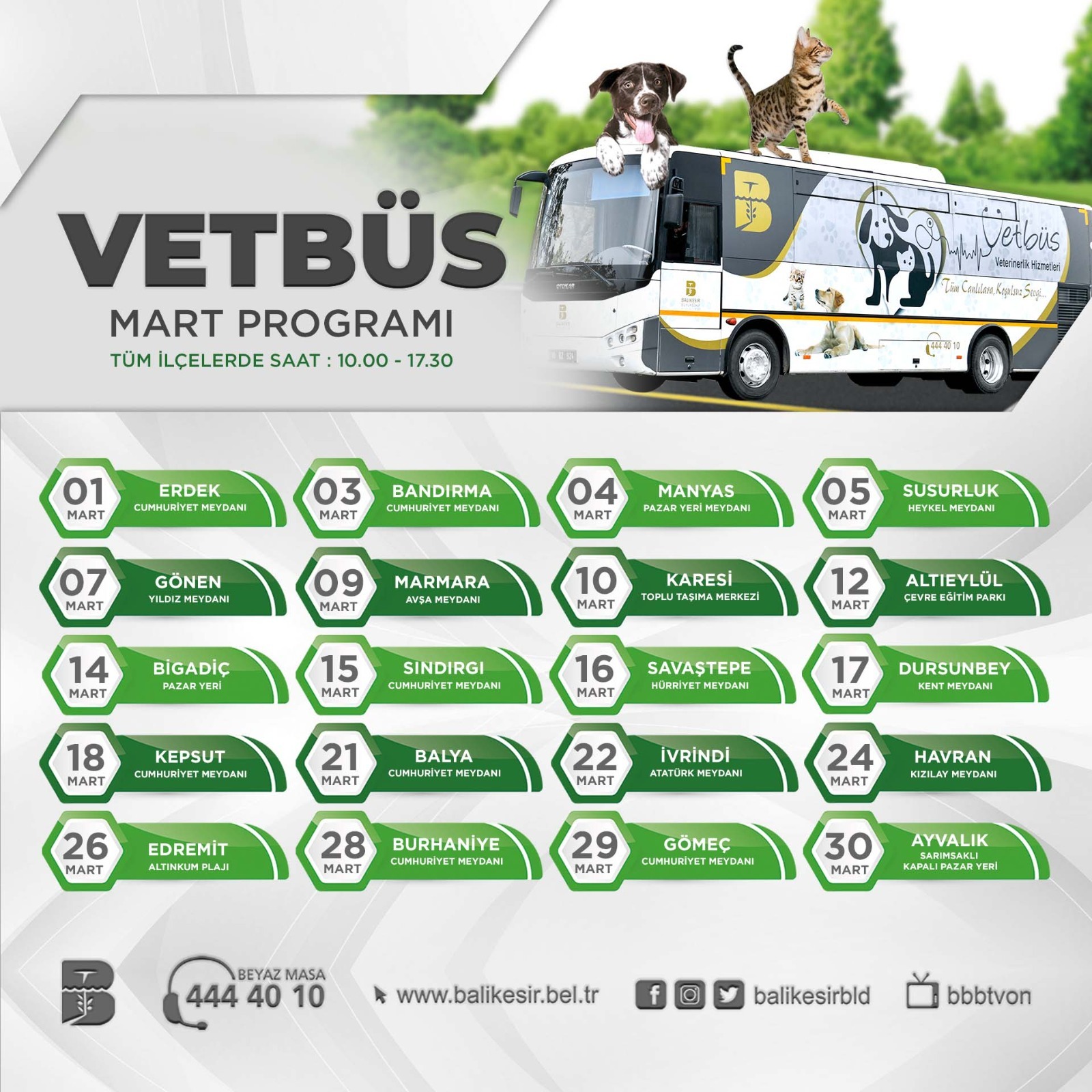 1 Mart Erdek’te yolculuğuna başlayan VETBÜS, 3 Mart (bugün) Bandırma Cumhuriyet Meydanı, 4 Mart Manyas Pazar Yeri Meydanı, 5 Mart Susurluk Heykel Meydanı, 7 Mart Gönen Yıldız Meydanı, 9 Mart Marmara Avşa Meydanı, 10 Mart Karesi Toplu Taşıma Merkezi, 12 Mart Altıeylül Çevre Eğitim Parkı, 14 Mart Bigadiç Pazar Yeri, 15 Mart Sındırgı Cumhuriyet Meydanı, 16 Mart Savaştepe Hürriyet Meydanı, 17 Mart Dursunbey Kent Meydanı, 18 Mart Kepsut Cumhuriyet Meydanı, 21 Mart Balya Cumhuriyet Meydanı, 22 Mart İvrindi Atatürk Meydanı, 24 Mart Havran Kızılay Meydanı, 26 Mart Edremit Altınkum Plajı, 28 Mart Burhaniye Cumhuriyet Meydanı, 29 Mart Gömeç Cumhuriyet Meydanı ve 30 Mart Ayvalık Sarımsaklı Kapalı Pazar Yerinde olacak.